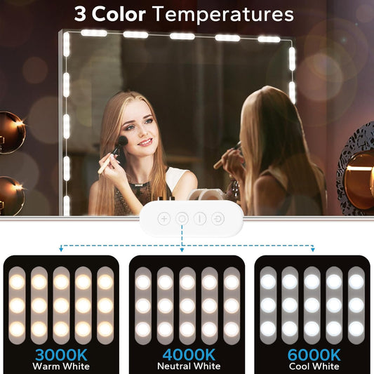 LED Vanity Mirror Lights with 12 Stick on Dimmable Bulbs, 3000K 4500K 6500K & 10 Brightness Levels Adjustable, Plug in USB Cable, Hollywood Style Mirror Lights for Makeup Desk Bathroom Dressing Room