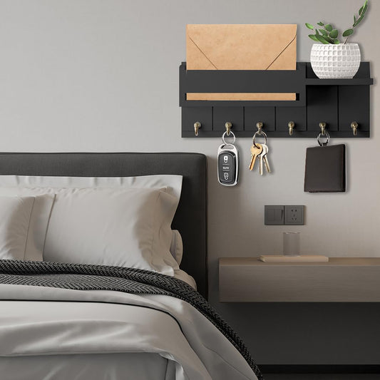 Key Holder Wall Mount, Decorative Key Rack and Mail Organizer with 6 Key Hooks, Wooden Key Hanger with Shelf for Living Room Decor, Rustic Farmhouse Home Entryway Aesthetic Essentials