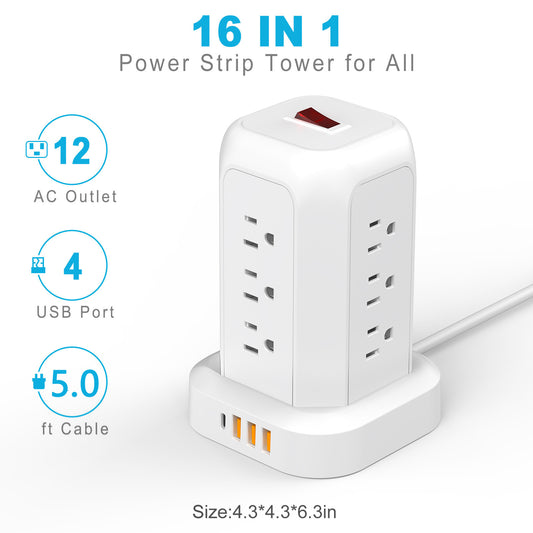 Tower Power Strips with Surge Protection, OGEDNAC Surge Protector with 12 Outlets 4 USB Ports, 5.1FT Extension Cord Desk Charging Station for Home Office Supplies Dorm Essentials, White