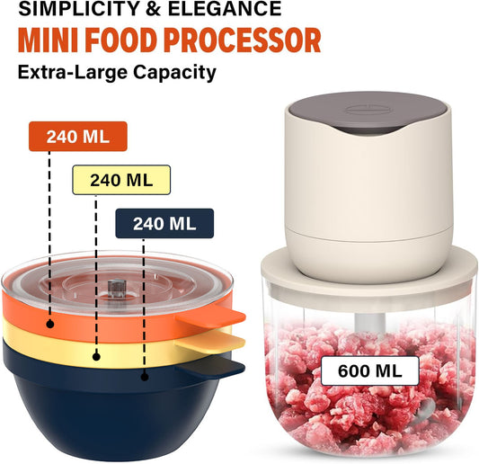 OGEDNAC Food Processor, Electric Food Chopper with 4 Bowls (2.5 Cup+3 * 1 Cup), Meat Grinder with 2 Sets Stainless Steel Blades, Small Blender for Baby Food, Meat and Vegetables, Beige
