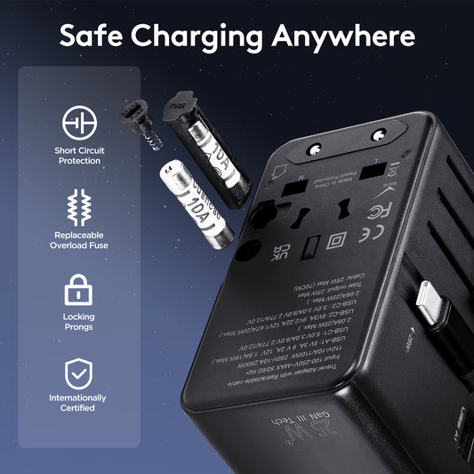 Universal Travel Adapter, OGEDNAC 25W GaN International Plug Adapter with 25W Retractable PD Fast Charge Cable, EU/UK/AU/US Worldwide Power Outlet with 4 USB(3 USB C) Charging Ports for Phones, Black