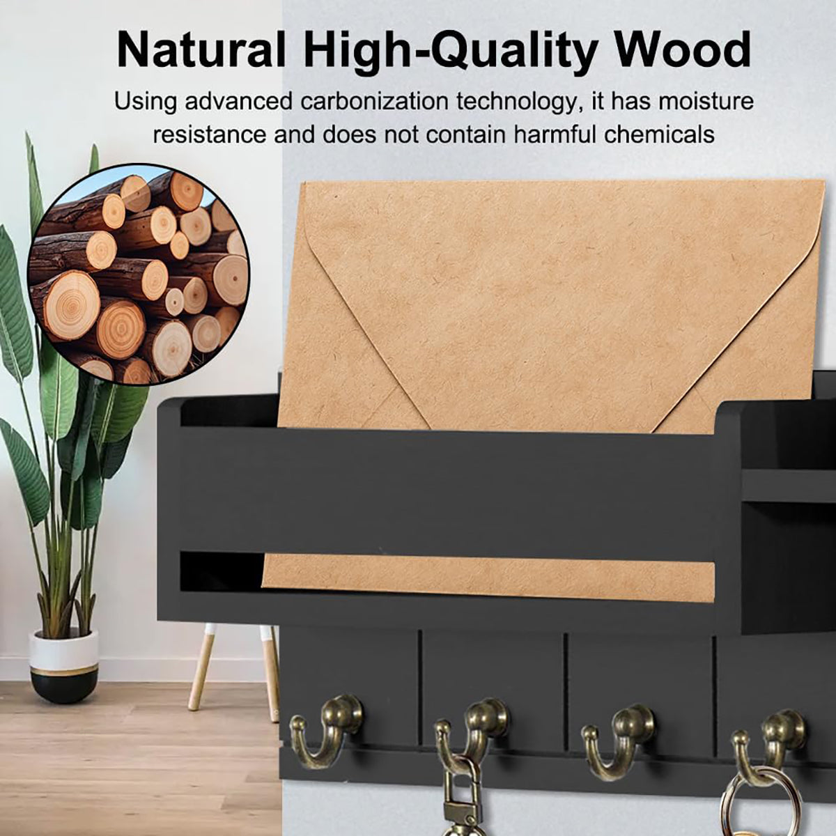 - Unique Functional Area: We design three function areas to match your storage needs. There are 6 key hooks on the shelf, it can hold your keys,bags,caps,wallets and so on. The mail sorter is 3 1/9’’x7 7/8’’, it fits most of US standard envelope and post card, the right display board can put small plants and anything you like.