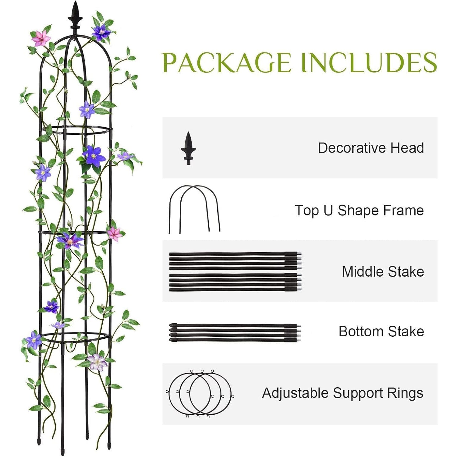 - 【Rust-proof & Weather-resistant 】 Metal poles with a plastic casing that contains UV inhibitors to resist sun damage and fading, gentle to plant stems; The plant support trellis is rust-proof, with 3 adjustable plastic support rings