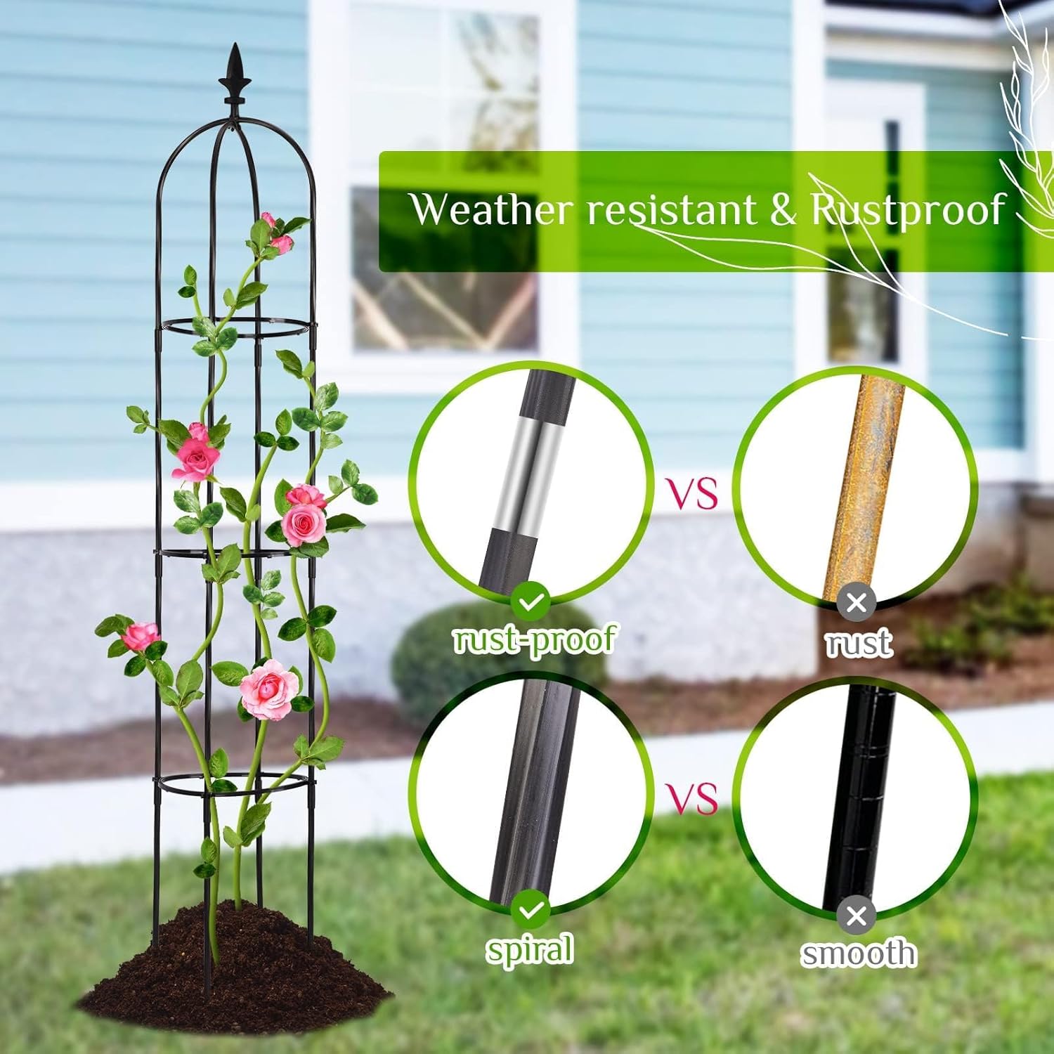 - 【Tall and Decorative】 1 pack, 69" High x 12" Wide garden obelisk trellis. They are great for training climbing vegetable plants and showcasing their beauty indoor outdoorThe surface of the tube is spiral, and fleur-de-lis finial at the top