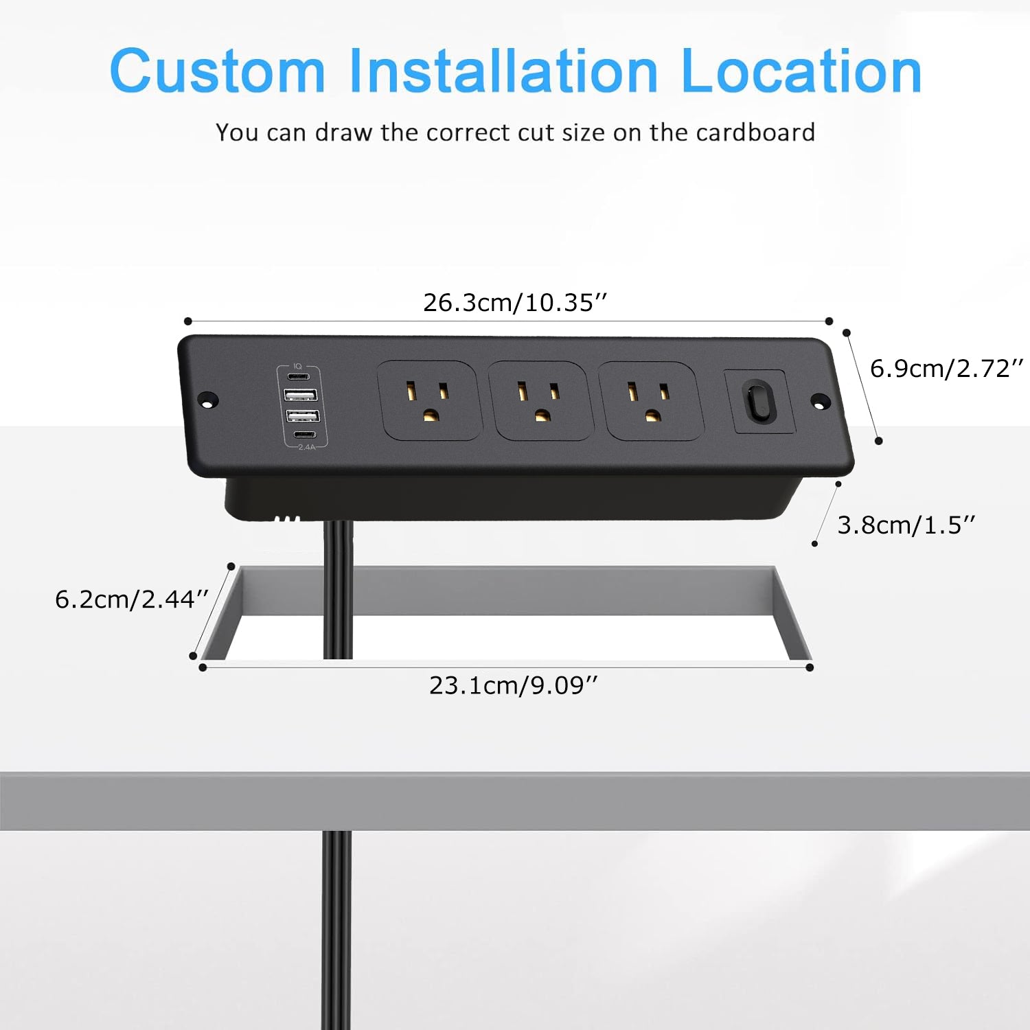Recessed Power Strip, Furniture Desk Drawer Outlet with 2 USB-C & 2 USB-A, Plug in 3 Outlets, Flush Mount 5.6FT Bold Extension Cord Conference Desk Outlet Fast Charge for Home Office, Black